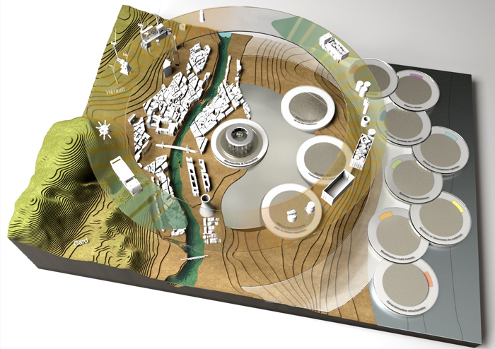 La maquette a été réalisé avec un ensemble de techniques hybrides : impression 3d, découpe laser, moulage en epoxy et éléments imprimés.